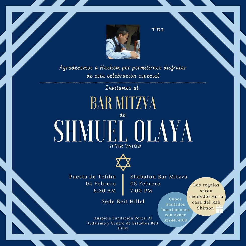 Bar Miztvah Shmuel OlayaCentro de Estudios Beit Hillel3 feb 20211 Min. de lecturaEstamos orgullosos de Shmuel Olaya cumpla sus 13 años y celebrar su Bar Miztvah con nosotros. Te deseamos larga vida, sabiduria y crecimiento en la torah. Hasta 120